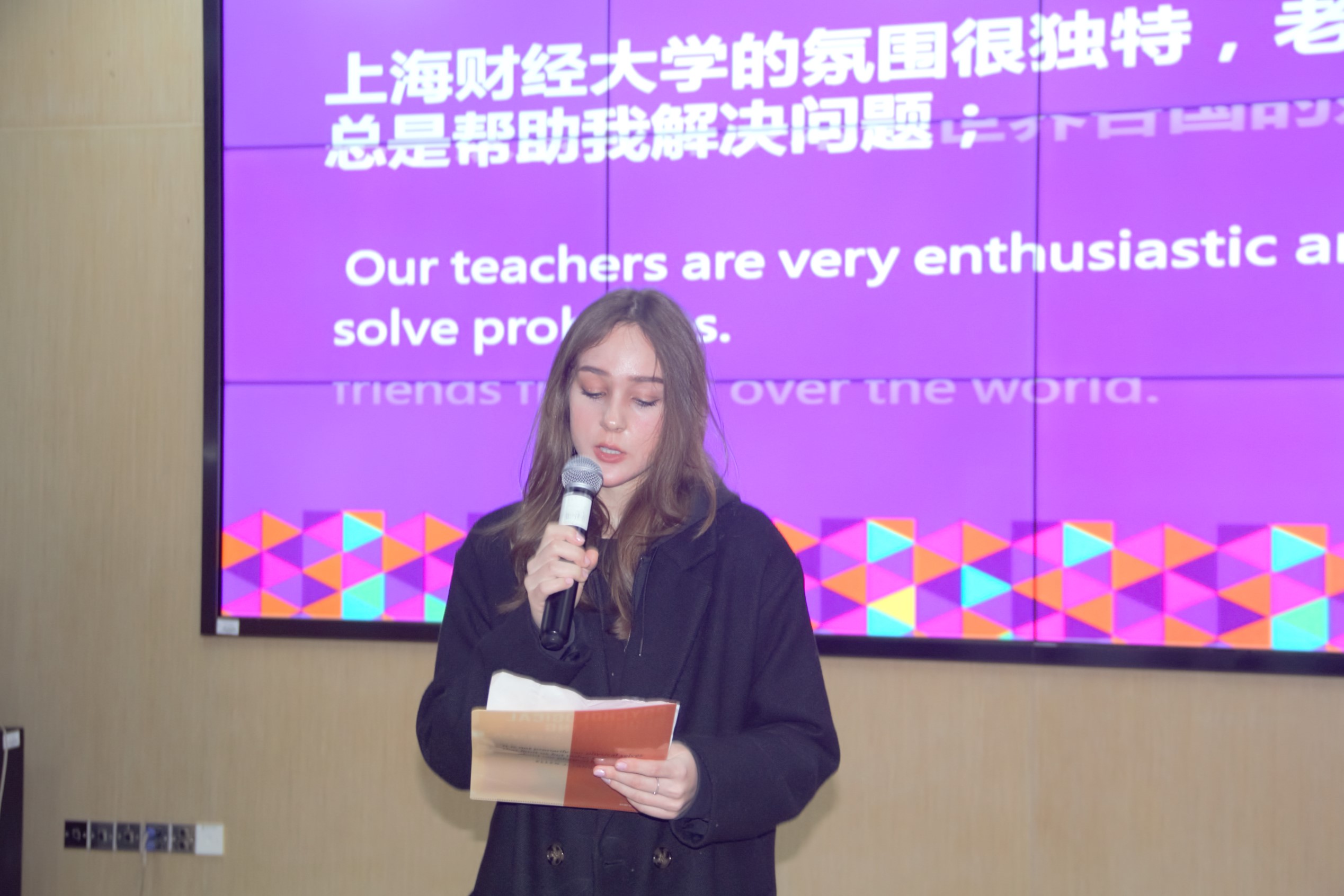 Anna Zaitseva, a student from Russia, shared her experience of learning Chinese in fluent Mandarin. She believes that the best way to learn Chinese is to come to China and communicate in Chinese within the environment. The care and encouragement from her fellow students at SUFE made her learning process less arduous than she had imagined. She encouraged everyone to study diligently and not be afraid of difficulties.