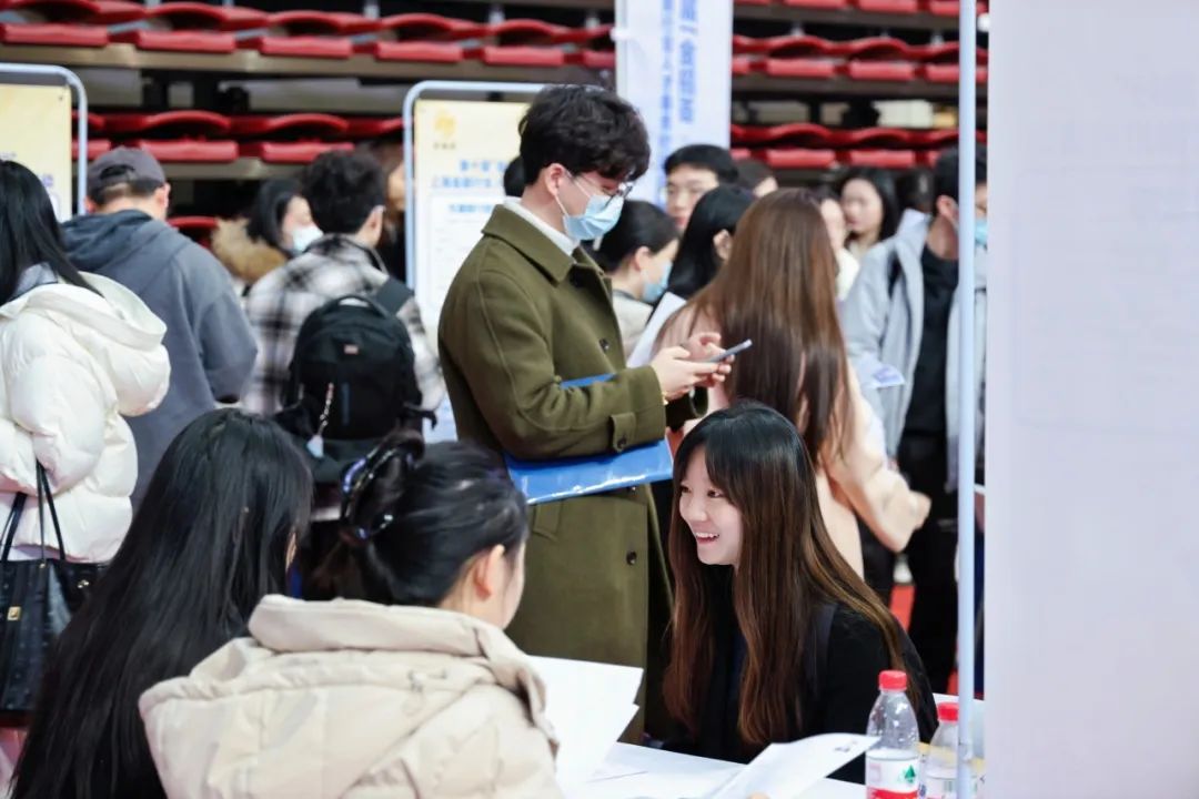 Marking the beginning of the spring recruitment season at SUFE, both the supply and demand sides were well-prepared. At 1:30 PM, the recruitment fair officially kicked off. Dressed in professional attire, students inquired at the booths of companies that interested them, eagerly submitting their resumes and engaging in in-depth discussions with employers about job requirements and career development paths. This showcased the professionalism and youthful sense of responsibility of SUFE's students, who are ready to contribute to national development. Recruitment managers carefully answered job-related questions.