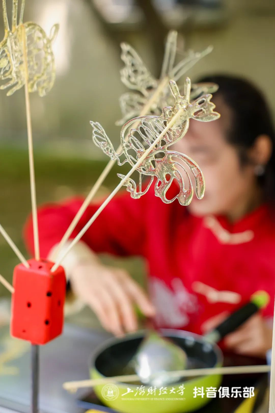 Traditional skills that have lasted for thousands of years are passed down through fingertips. A non-heritage cultural fair was also set up on site, integrating non-heritage skills with a campus filled with the fragrance of books. Under the guidance of craftsmen, students and teachers of Shanghai University of Finance and Economics personally experienced traditional skills such as foil painting, printing, sugar blowing, clay figurines, grass weaving, and dyeing, cultivating their recognition and love for traditional culture and igniting the fire of inheritance in their hearts.