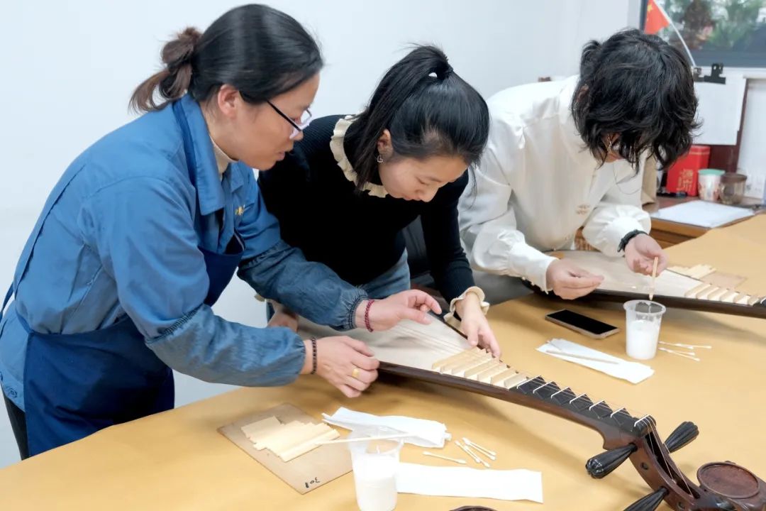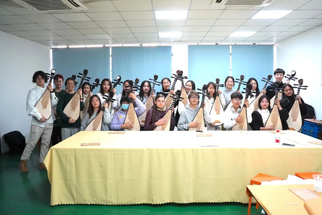 最后,同学们来到了乐器生产车间,充分体验了琵琶制作过程的最后一步“粘品”,了解琵琶构造之精妙。在完成制作后大家纷纷和各自制作的琵琶合影留念,体味“犹抱琵琶半遮面”的独特韵味。